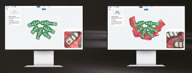 Dabei werden zwei Datensätze in einem Scan mit eurem Intraoralscanner erfasst: Weichgewebe und dier äumliche Position der Scanbodys.